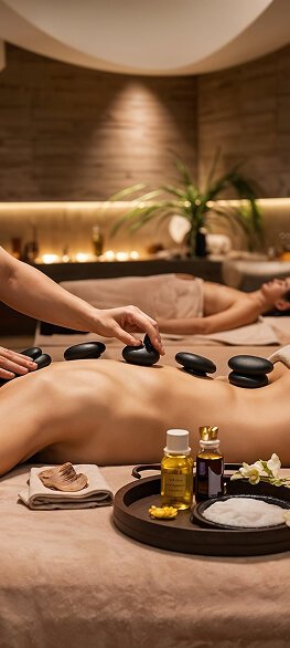 Experience the warmth of volcanic stones placed on key points to release tension and promote deep relaxation.